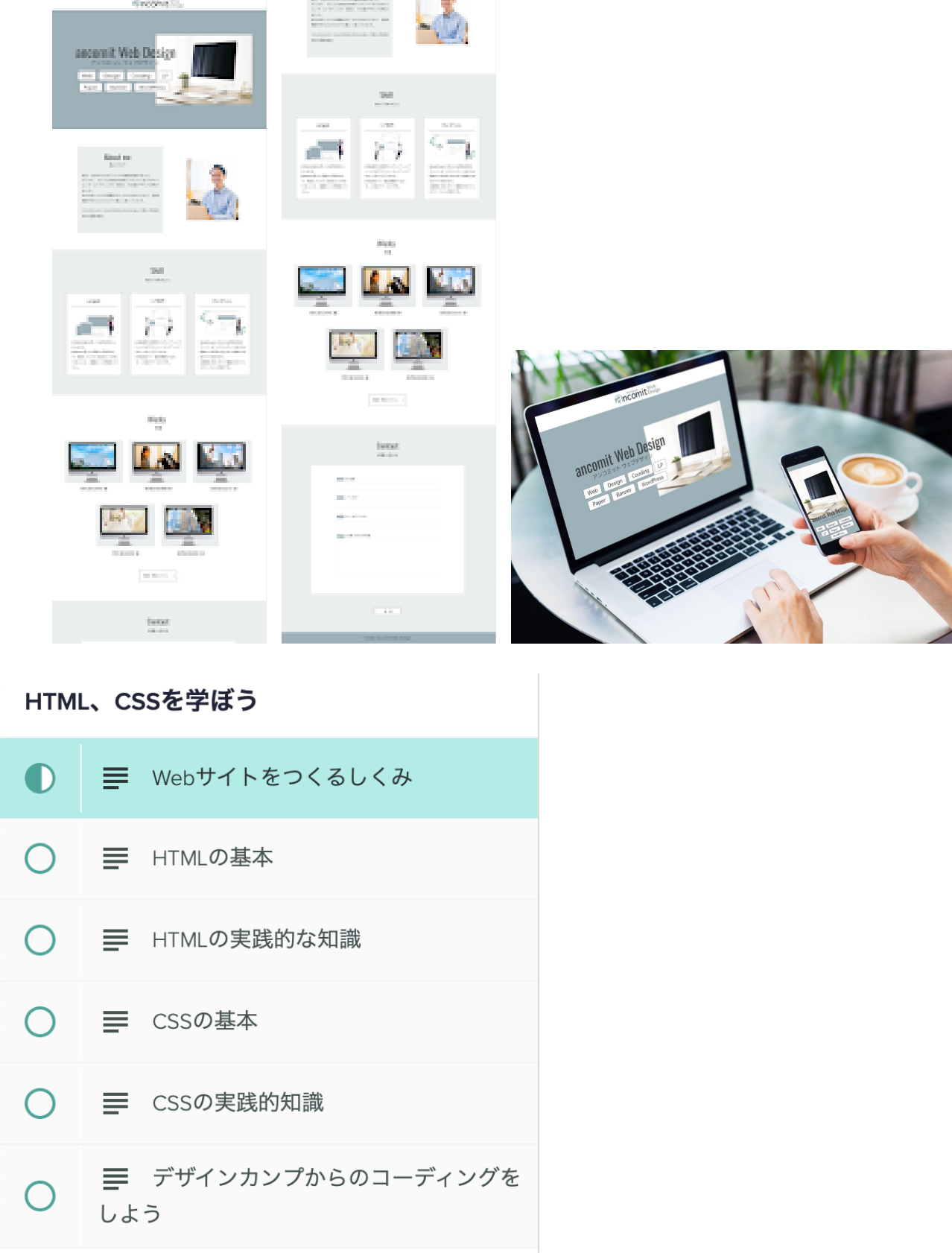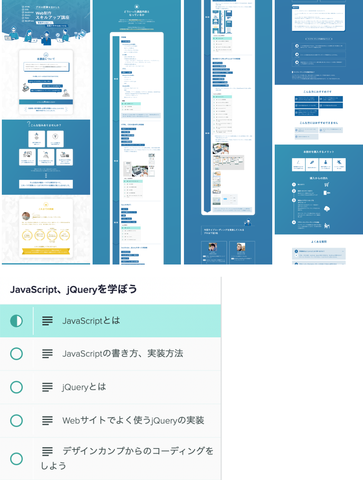 HTML、CSSの基礎、JavaScript、jQueryの動きの実装方法、WordPressの構築方法をデ ザインカンプからのコーディングができるレベルまでのスキルが身に付きます。