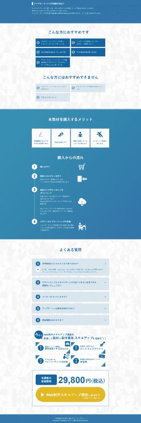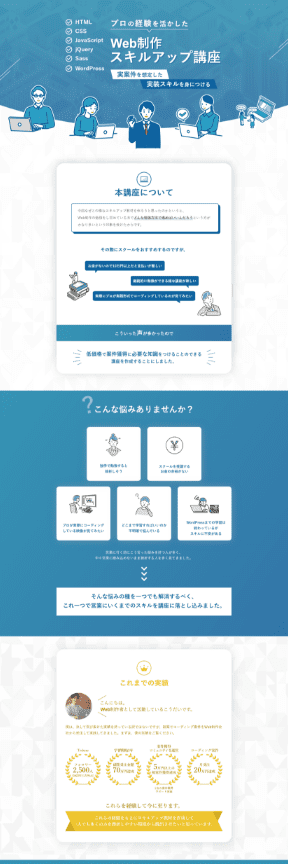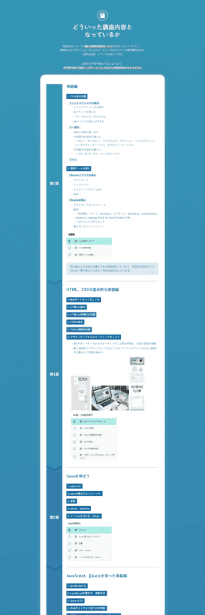 HTML、CSSの基礎、JavaScript、jQueryの動きの実装方法、WordPressの構築方法をデ ザインカンプからのコーディングができるレベルまでのスキルが身に付きます。